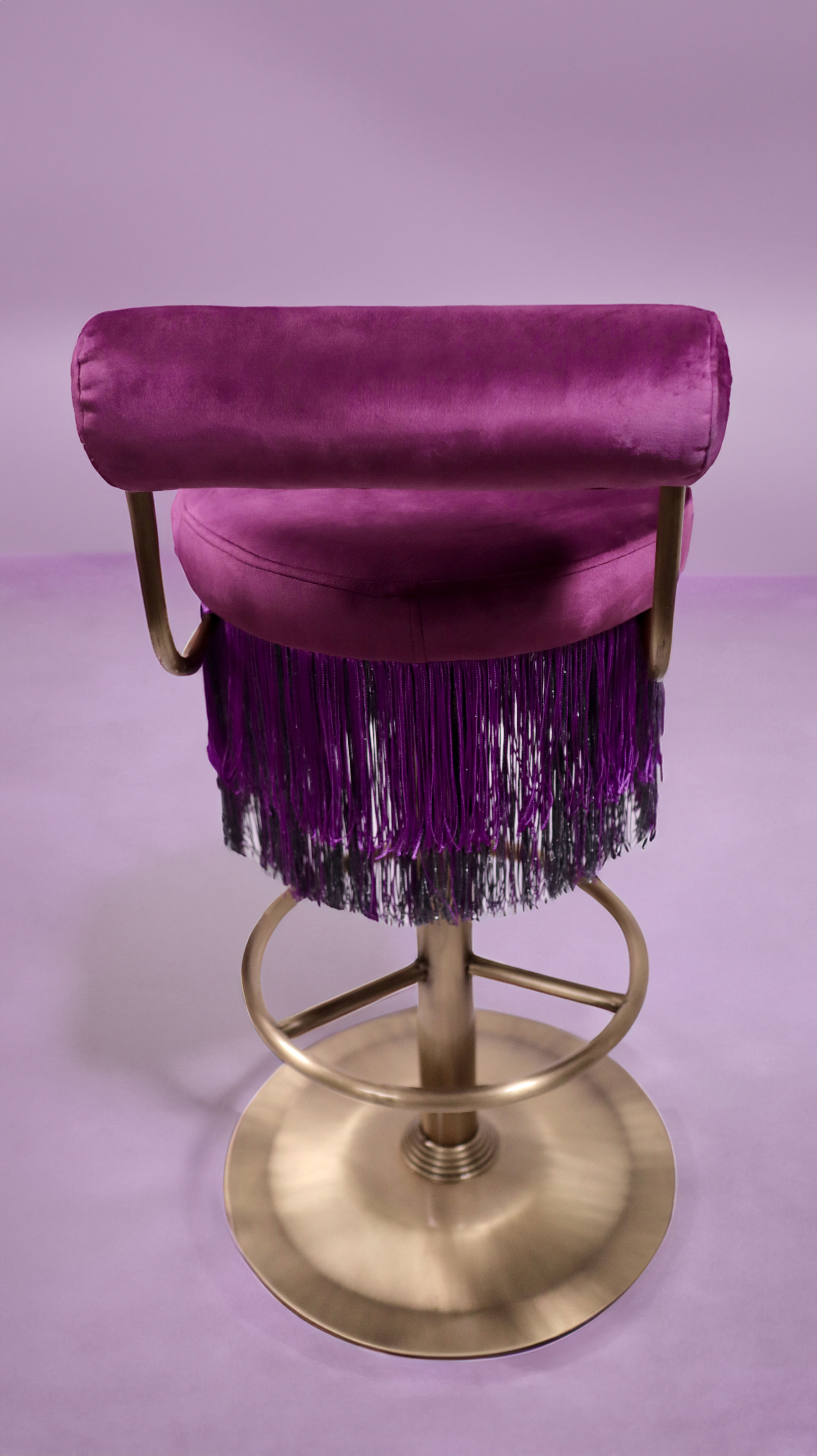 Chick bar taburesi, retro ve modern tarzları bir araya getirerek zarif bir estetik sunar. Canlı mor kadife kumaşıyla yumuşak ve konforlu bir oturum sağlar, alt kısmındaki zarif ip detayları ise tasarıma hareket ve incelik katar. Pirinç rengindeki ayak yapısı, sağlamlık ve şıklığı birleştirirken, ayak koyma yeri ekstra rahatlık sağlar. Yüksek arkalığı, destek sunarak uzun oturumlar için idealdir. Hem evinizdeki bar köşelerinde hem de ticari mekanlarda kullanabileceğiniz bu sandalye, bulunduğu ortama stil sahibi bir hava katmak için tasarlanmıştır.